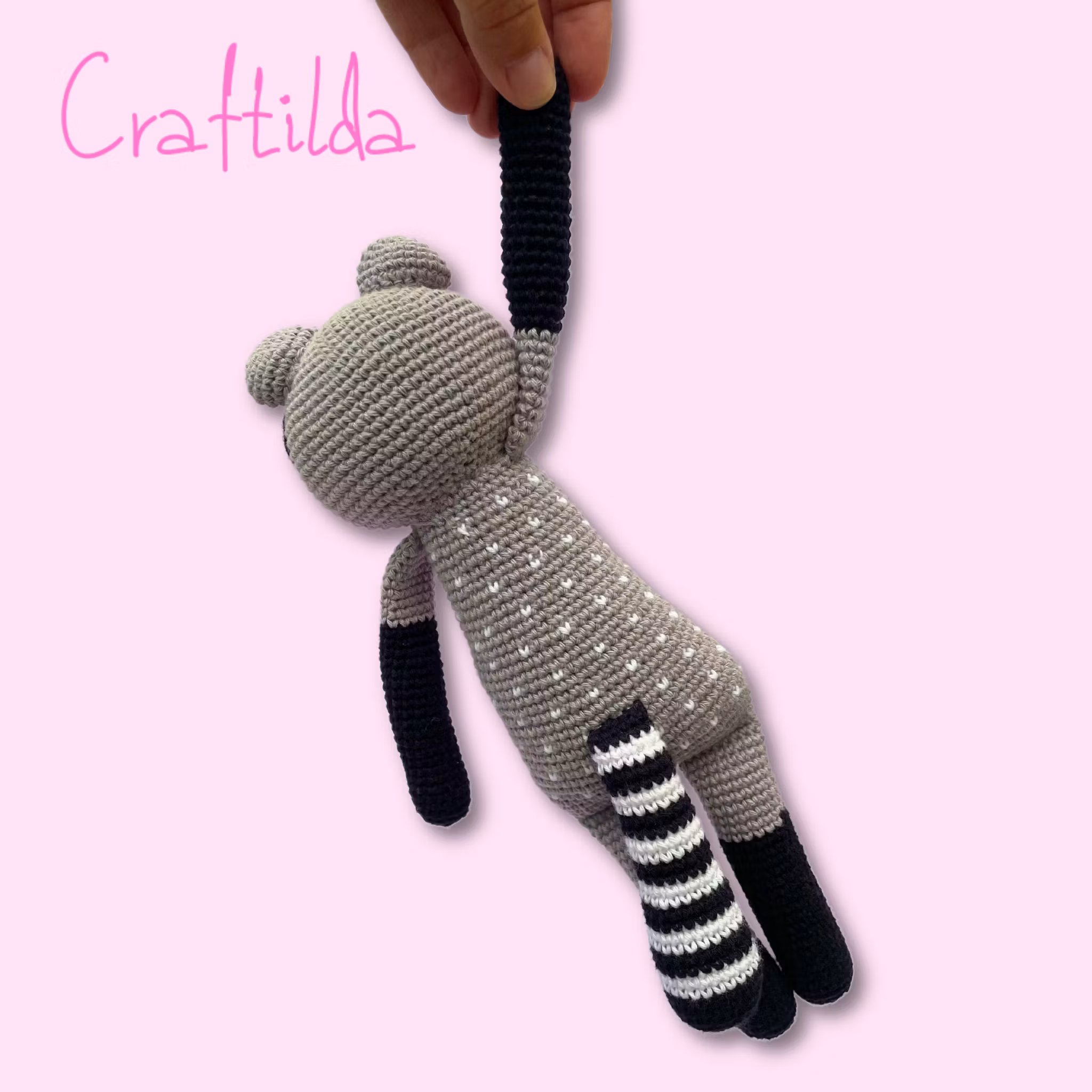Virkad amigurumi i form av en tvättbjörn. Virkad i bomullsgarn och stoppad med polyester.