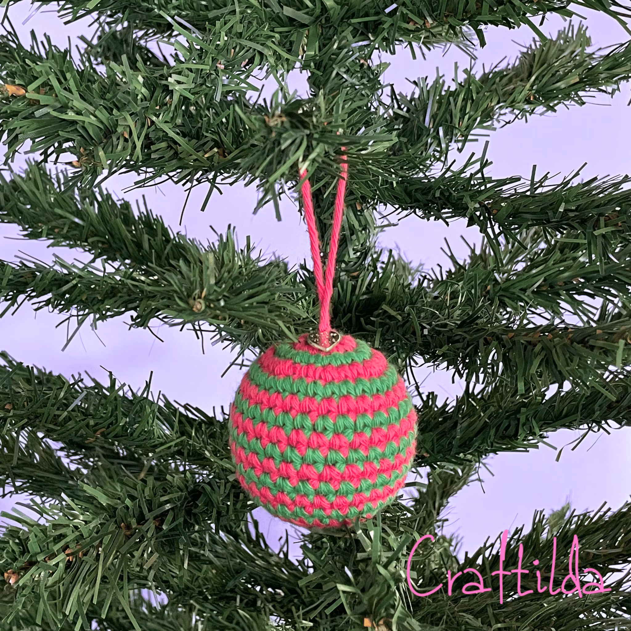 Julgranskula rosa/grön 145 kr Produkten är tyvärr slut i lager. MATHILDA FALLENIUSVirkade julgranskulor av bomullsgarn över en styrolitkula. Kulan är 55 mm i diameter och finns som randig i rosa/grönt och blått/silver samt jultomte och snögubbe.